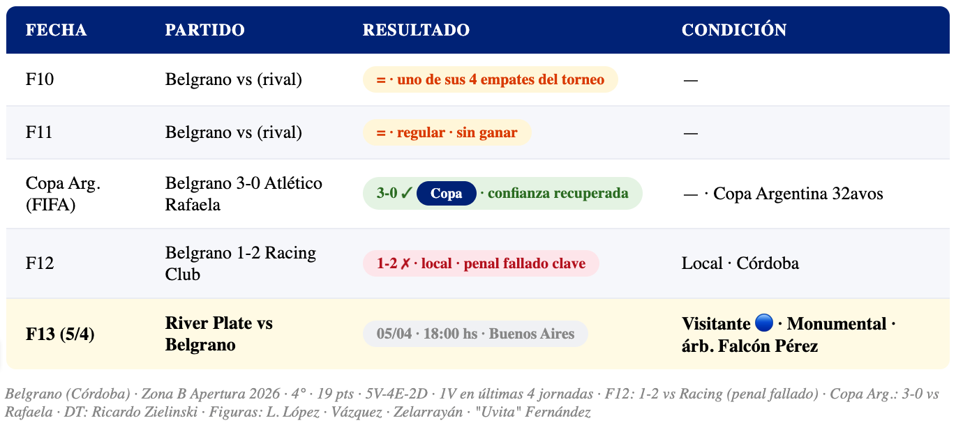 Belgrano de Córdoba de Ricardo Zielinski llega al Monumental como uno de los equipos más regulares de la Zona B — pero el último tramo fue irregular. La derrota 1-2 ante Racing fue dolorosa porque el equipo "compitió de igual a igual y contó con situaciones claras, incluido un penal fallado" (DAZN). En Copa Argentina recuperó confianza con el 3-0 sobre Atlético Rafaela. Los referentes son experimentados: Lisandro López, Franco "Mudo" Vázquez, Lucas Zelarrayán y Nicolás "Uvita" Fernández. Históricamente Belgrano ganó solo 1 de los últimos 6 duelos vs River, pero esa única victoria fue en el Monumental (2-1, Liga 2023).