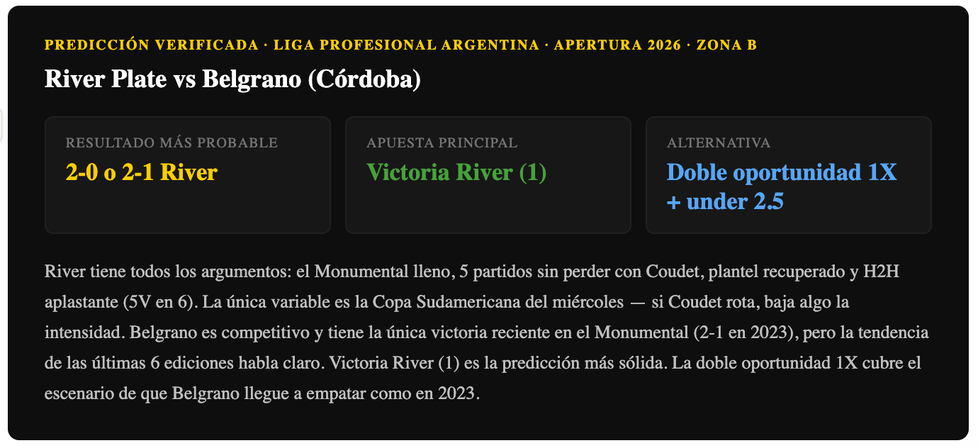 River es el favorito — el Monumental, la racha de 5 sin perder con Coudet y el H2H demoledor (5V en 6) lo respaldan. El factor Copa Sudamericana del miércoles puede hacer que el DT rote, pero el equipo tiene plantel suficiente. Belgrano es competitivo y tiene un histórico del 2-1 en el Monumental en 2023, pero la tendencia reciente es muy clara. Victoria River (1) y under 2.5 goles tienen el mayor respaldo.