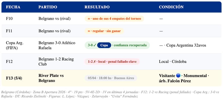 📊 Belgrano — F13: 4° Zona B · 19 pts · 5V-4E-2D · 1 victoria en últimas 4 (Liga)