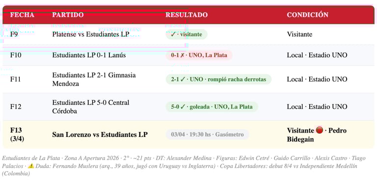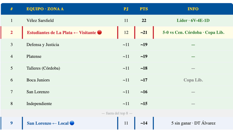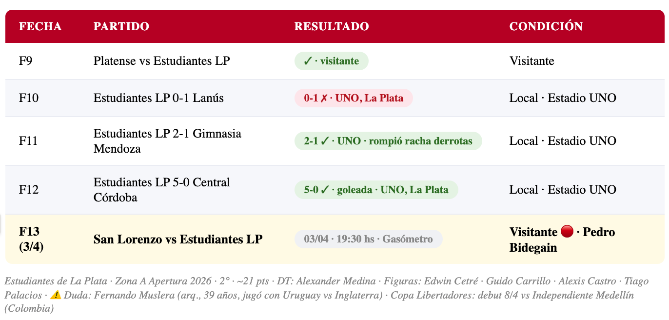 📊 Estudiantes de La Plata — F13: 2° (o 1°) Zona A · ~21-22 pts · en racha positiva
