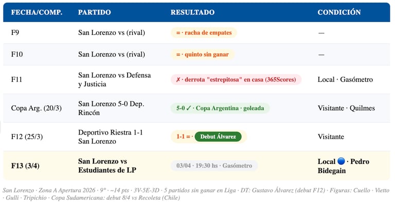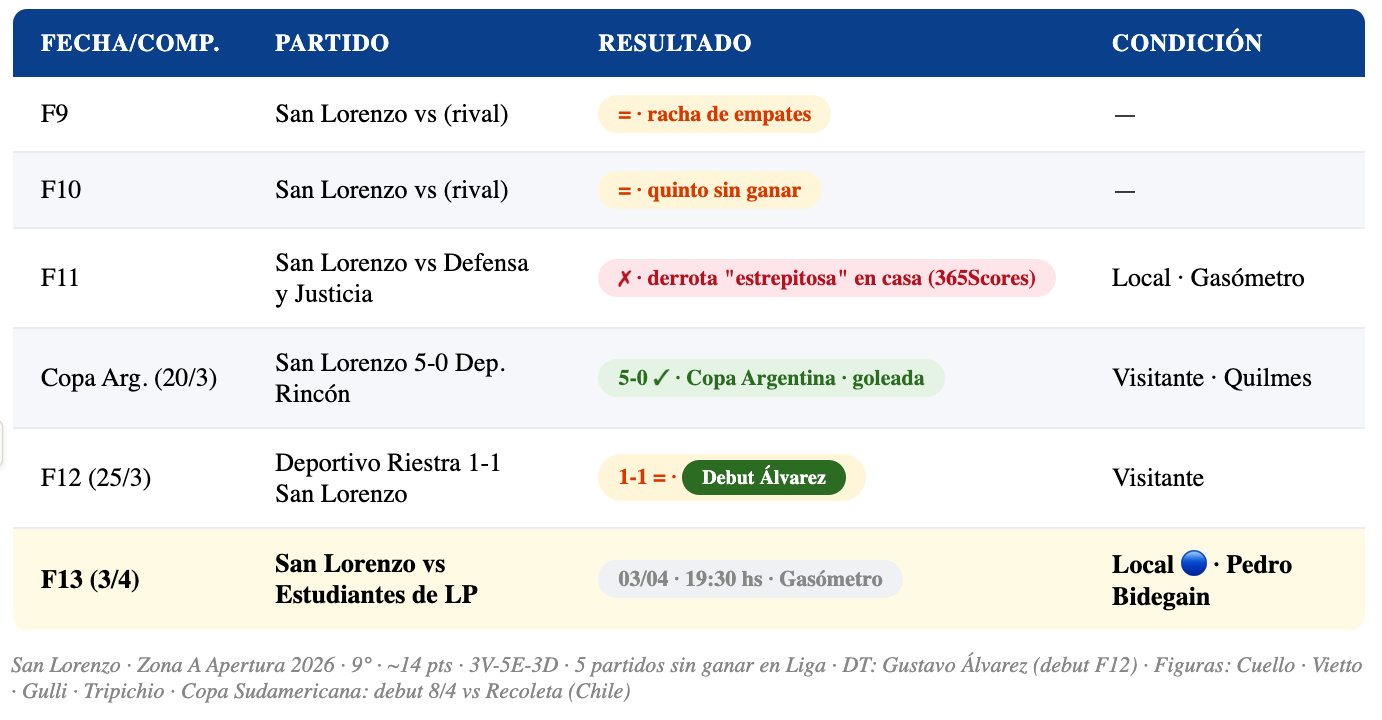 📊 San Lorenzo — F13: 9° Zona A · ~14 pts · 3V-5E-3D · 5 partidos sin ganar
