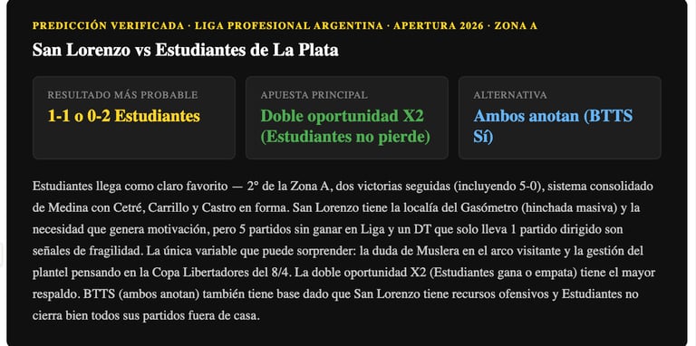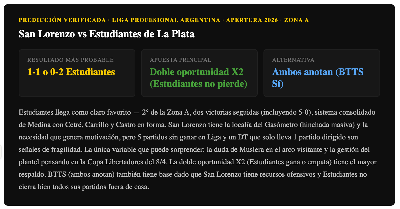 Estudiantes llega como favorito claro — escolta (o líder) de la Zona A, en racha de dos victorias seguidas, con figuras en forma y el sistema de Medina bien aceitado. San Lorenzo tiene la localía del Gasómetro y la motivación de la hinchada propia, pero 5 partidos sin ganar y un DT que recién empieza hablan de una situación frágil. La doble oportunidad X2 (Estudiantes no pierde) tiene el mayor respaldo estadístico. La variable Muslera es la única incógnita que podría perjudicar al visitante.
