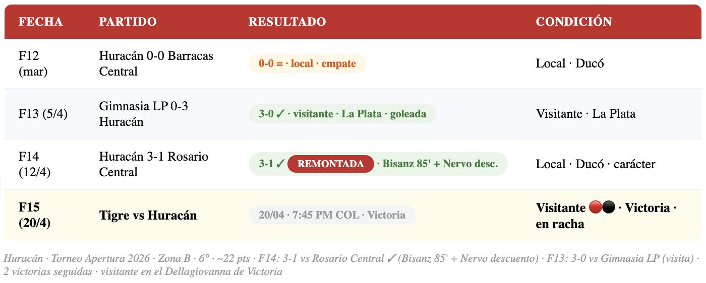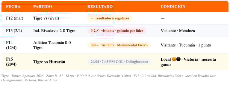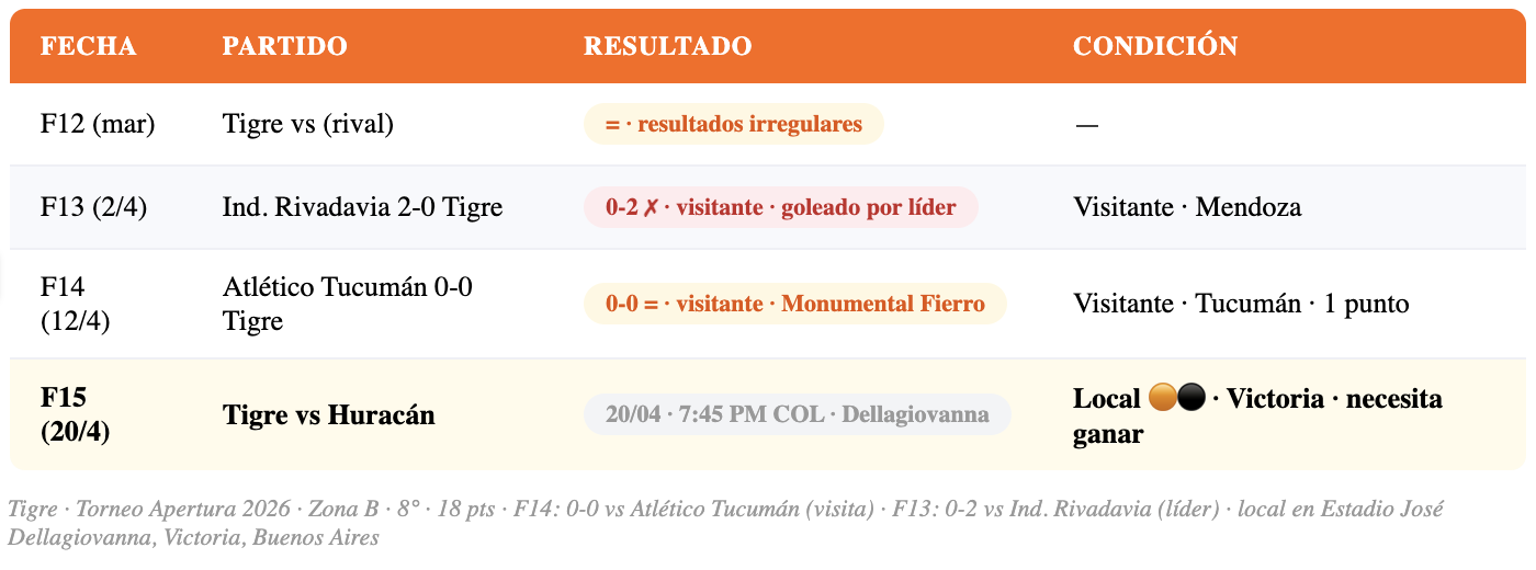 Tigre llega al partido en la 8ª posición con 18 puntos — el último cupo del playoff de la Zona B. El empate 0-0 de visitante en Tucumán en F14 fue un resultado que mantiene al Matador en zona de clasificación, pero sin margen de error. En casa, en el Estadio Dellagiovanna de Victoria, el equipo del norte del Conurbano bonaerense tiene un ambiente de apoyo. Necesita los tres puntos ante un rival directo como Huracán para consolidar su posición.