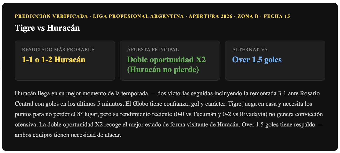 Pronóstico Tigre vs Huracán — Liga Argentina Apertura 2026