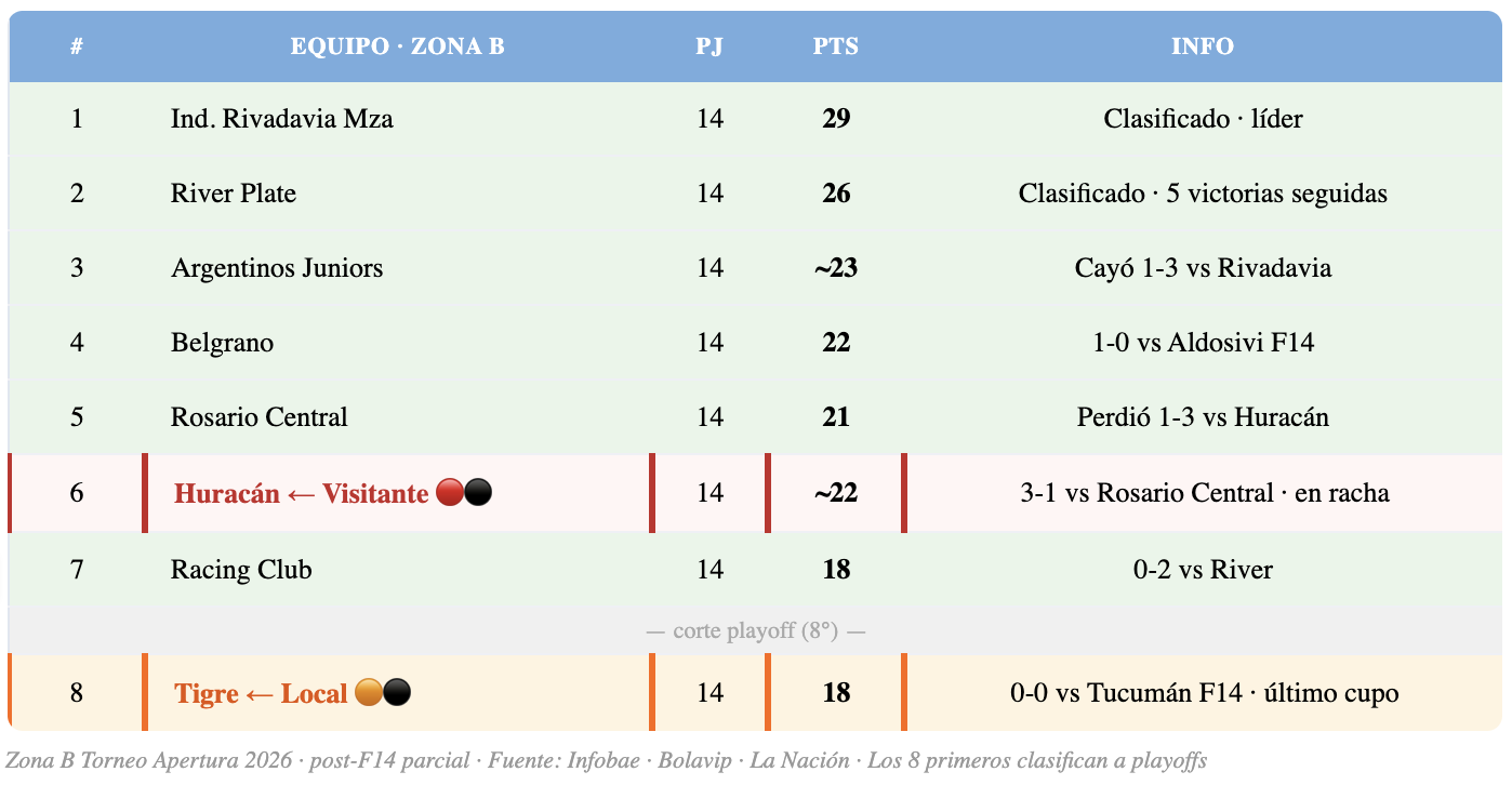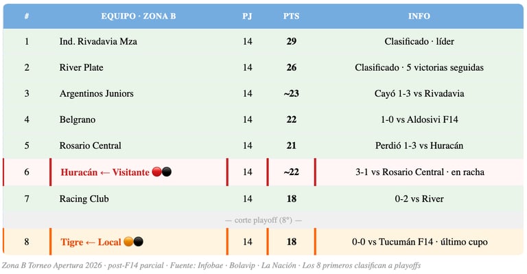 📊 ZONA B post-F14: Ind. Rivadavia 29 (clasificado) · River 26 (clasificado) · Belgrano 22 · Rosario Central 21 · Argentinos ~23 · Huracán 6° · ~22 pts · ... · Tigre 8° · 18 pts