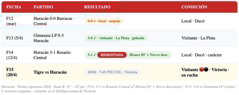 🔴⚫ Huracán — F15: 6° Zona B · ~22 pts · visitante · Victoria