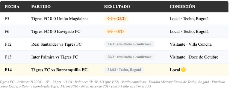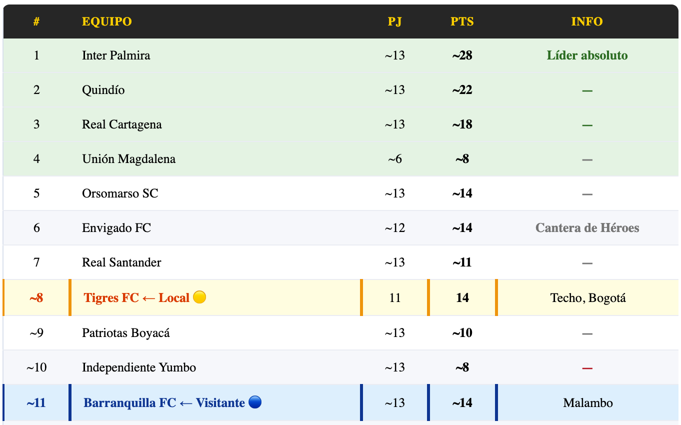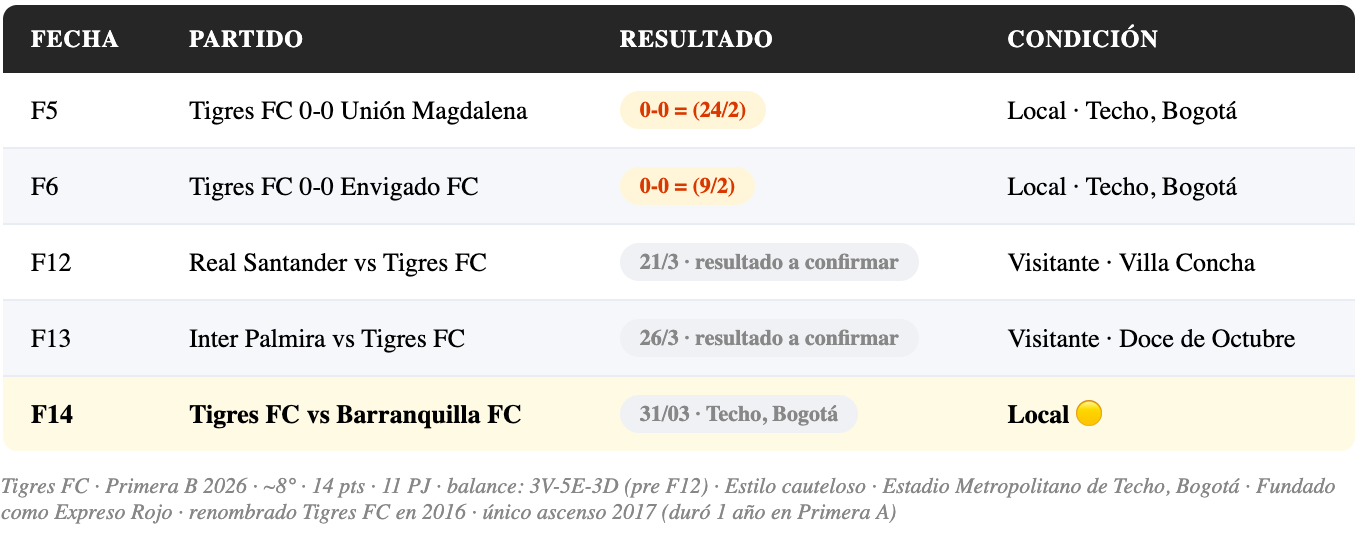 Tigres FC llega a este partido en una posición de mitad de tabla que refleja su campaña consistente pero sin explosiones. Con 14 puntos en 11 partidos (3 victorias, 5 empates, 3 derrotas) antes de la jornada 12, el equipo bogotano tiene un perfil defensivo y cauteloso — el Online Betting Academy lo describió como un equipo con "modest goalscoring and conceding numbers, reflecting a more cautious style of play." Sus figuras: Samuel Flores y Miguel Álvarez como referencias ofensivas, con Brandon Mejía como motor desde el mediocampo.