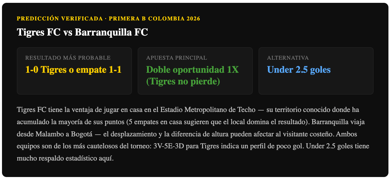Pronóstico Tigres FC vs Barranquilla FC — Primera B Colombia 2026