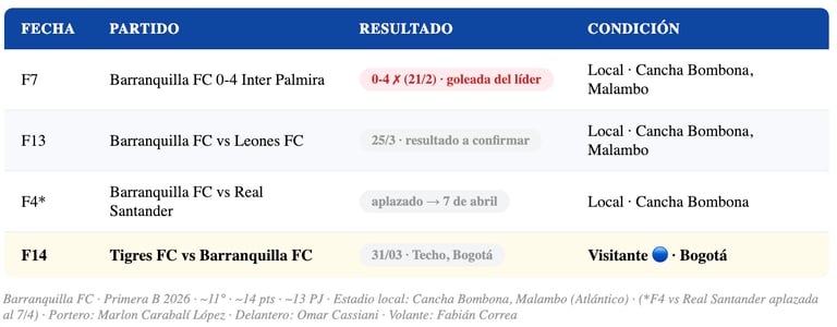 ⚽ F7 (21/2): Barranquilla 0-4 Inter Palmira ✗ · F13 (25/3): Barranquilla vs Leones (resultado pendiente)