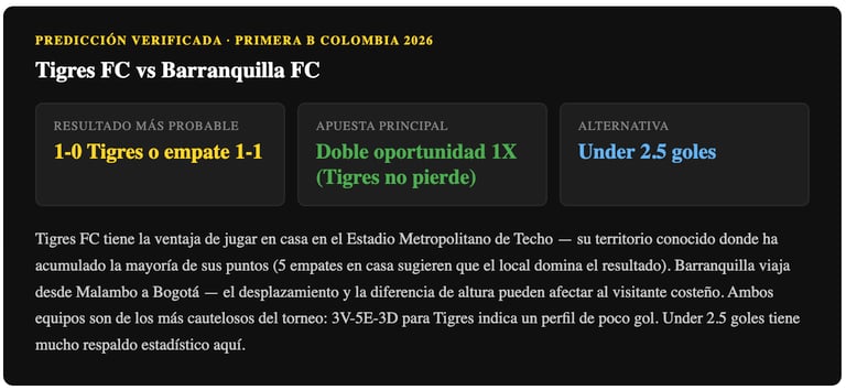 Tigres FC recibe a Barranquilla FC en el Estadio Metropolitano de Techo, Bogotá. Duelo directo de mitad de tabla en la Primera B: el ex Expreso Rojo bogotano vs el equipo costeño de Malambo. Predicción verificada.
