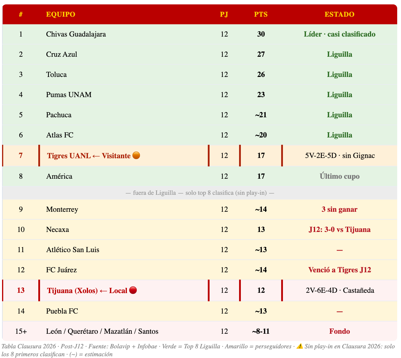 ⚽ J11: León 0-3 Tijuana ✓ · J12 (20/3): Necaxa 3-0 Tijuana ✗ (goleada en el Victoria)