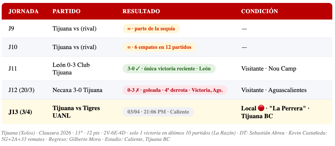 Tijuana pasa por su peor momento del Clausura 2026. La Razón de México es contundente: "solo suma una victoria en sus últimos diez encuentros." La goleada 3-0 sufrida ante Necaxa (J12) evidenció las debilidades defensivas del equipo de Sebastián Abreu. Con 12 puntos en 13°, la Liguilla es una quimera sin ganar varios partidos seguidos. La única buena noticia es el regreso de Gilberto Mora de lesión — Récord reporta que los aficionados esperan que tenga minutos. La figura indiscutida sigue siendo Kevin Castañeda, con 5 goles y 2 asistencias en 12 partidos y 33 remates al arco según WSN.