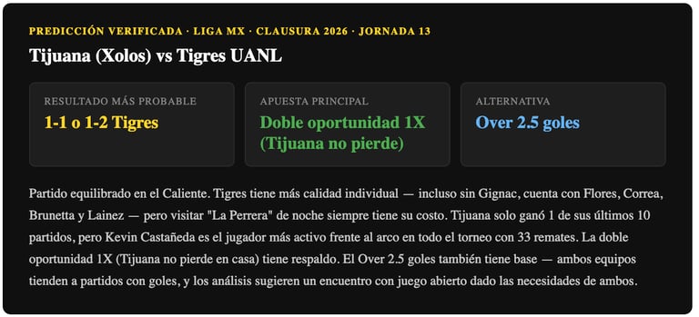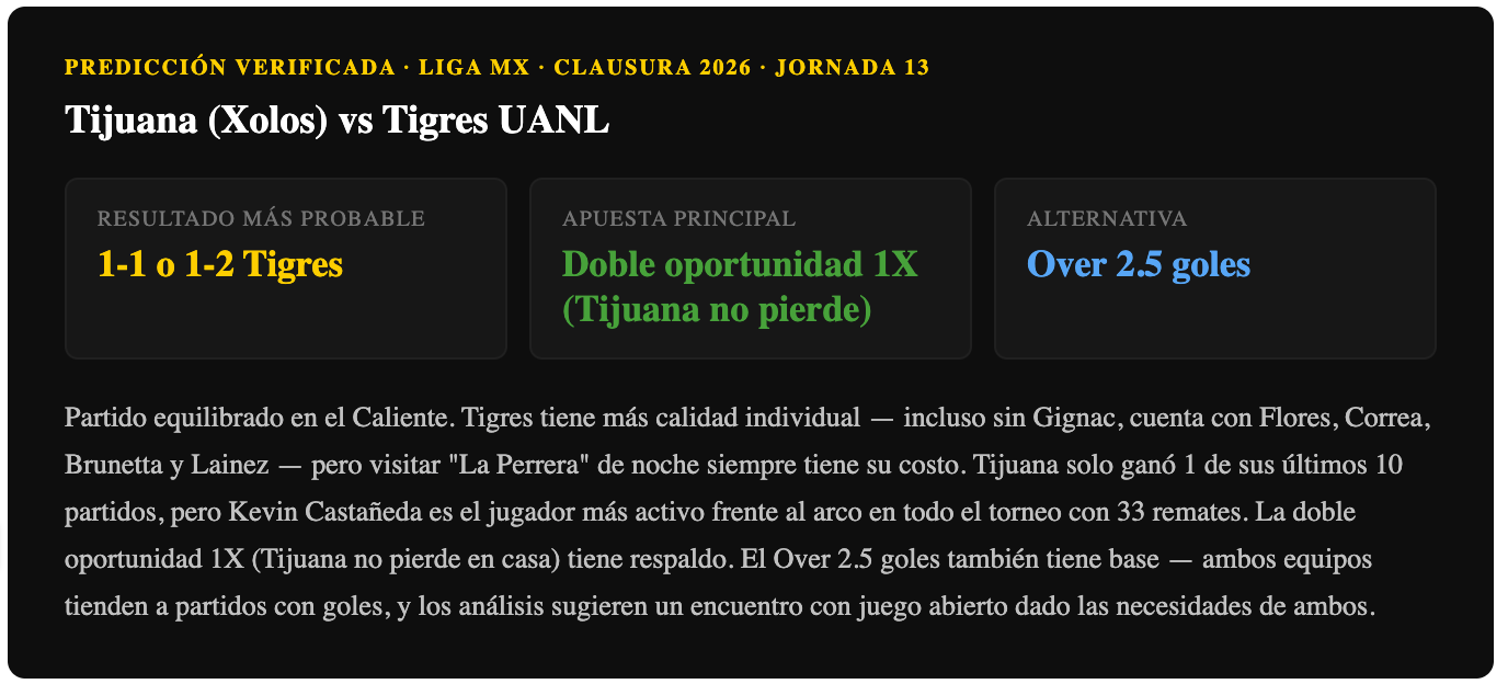 Partido equilibrado con ventaja leve para Tigres por calidad de plantel, pero la localía del Caliente y la necesidad de Tijuana equiparan la balanza. Tigres sin Gignac es un equipo más predecible. La doble oportunidad 1X (Tijuana no pierde) tiene respaldo por la localía y el contexto. Over 2.5 goles también tiene base — ambos equipos han estado involucrados en partidos con goles en el Clausura 2026.