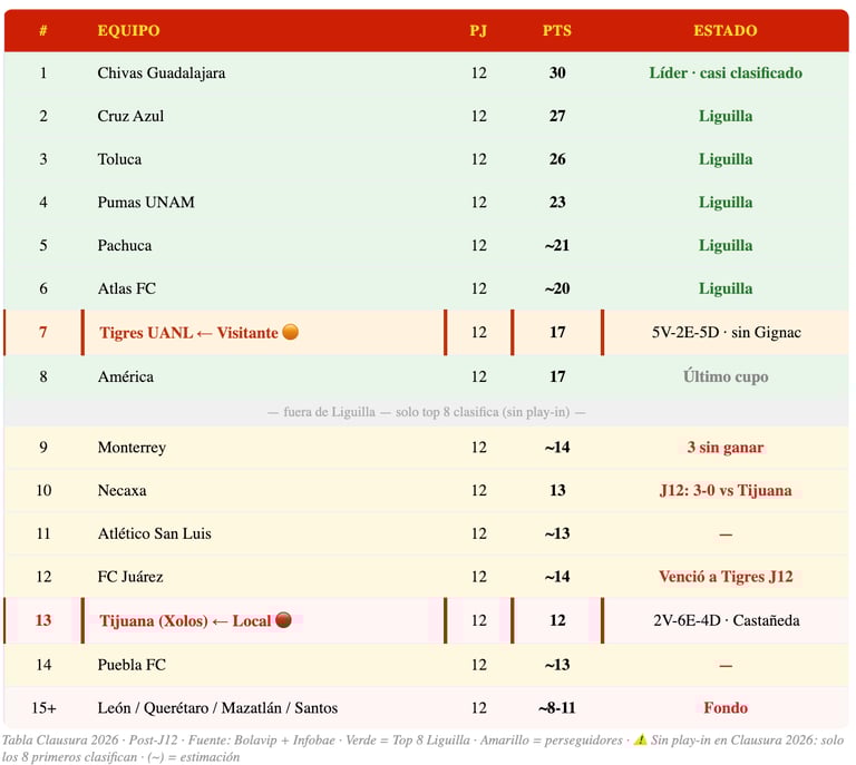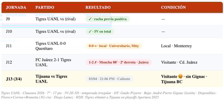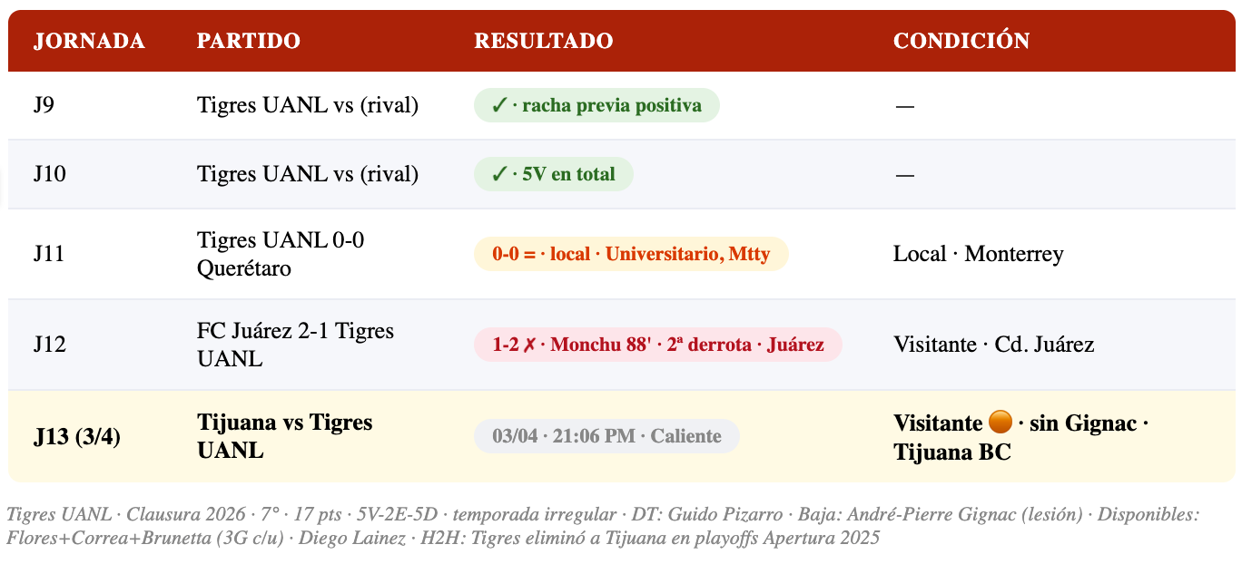 🏟️ Visitante en el Estadio Caliente, Tijuana · H2H reciente: Tigres eliminó a Tijuana en playoffs Apertura 2025