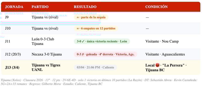 📊 Tijuana — J13: 13° · 12 pts · 2V-6E-4D · solo 1 victoria en últimos 10 partidos